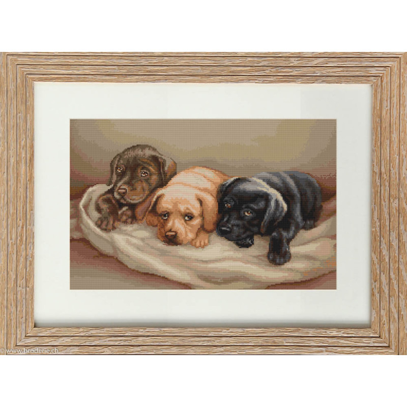 L'article 'Luca-S, kit Three dogs (LUCAB434)' fait partie de notre assortiment depuis le 2 octobre 2018. Luca-S est une gamme de points de croix comptés qui nous vient de Moldavie. Il y a beaucoup de modèles de personnages, paysages, nature morte, ainsi que de sympathiques kits pour Noël, des sacs à confectionner, des carttes postales à broder. Pour beaucoup de modèle vous pouvez aussi avoir le kit en canevas 25ct, pour des demi-points à compter (10/cm), ce qui fait la broderie bien plus petite et fine dans la rubrique Kits - Luca-S (P). Les kits sont fournis principalement sur de la trame aïda 6.4 points/cm ou 7 points/cm, ou de l'étamine de Zweigart, les coussins avec de l'étamine 8 fils ou 10 fils/cm. Les fils sont de la maison Anchor.