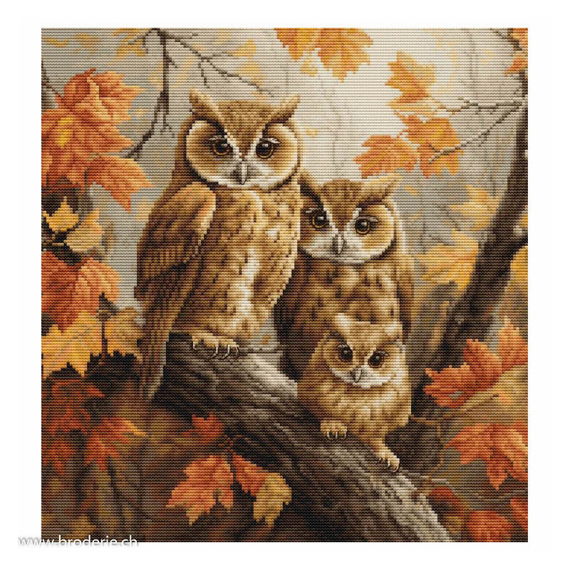 L'article 'Luca-S, kit The Owls Family (LUCASBU5045)' fait partie de notre assortiment depuis le 21 février 2024. Luca-S est une gamme de points de croix comptés qui nous vient de Moldavie. Il y a beaucoup de modèles de personnages, paysages, nature morte, ainsi que de sympathiques kits pour Noël, des sacs à confectionner, des carttes postales à broder. Pour beaucoup de modèle vous pouvez aussi avoir le kit en canevas 25ct, pour des demi-points à compter (10/cm), ce qui fait la broderie bien plus petite et fine dans la rubrique Kits - Luca-S (P). Les kits sont fournis principalement sur de la trame aïda 6.4 points/cm ou 7 points/cm, ou de l'étamine de Zweigart, les coussins avec de l'étamine 8 fils ou 10 fils/cm. Les fils sont de la maison Anchor.