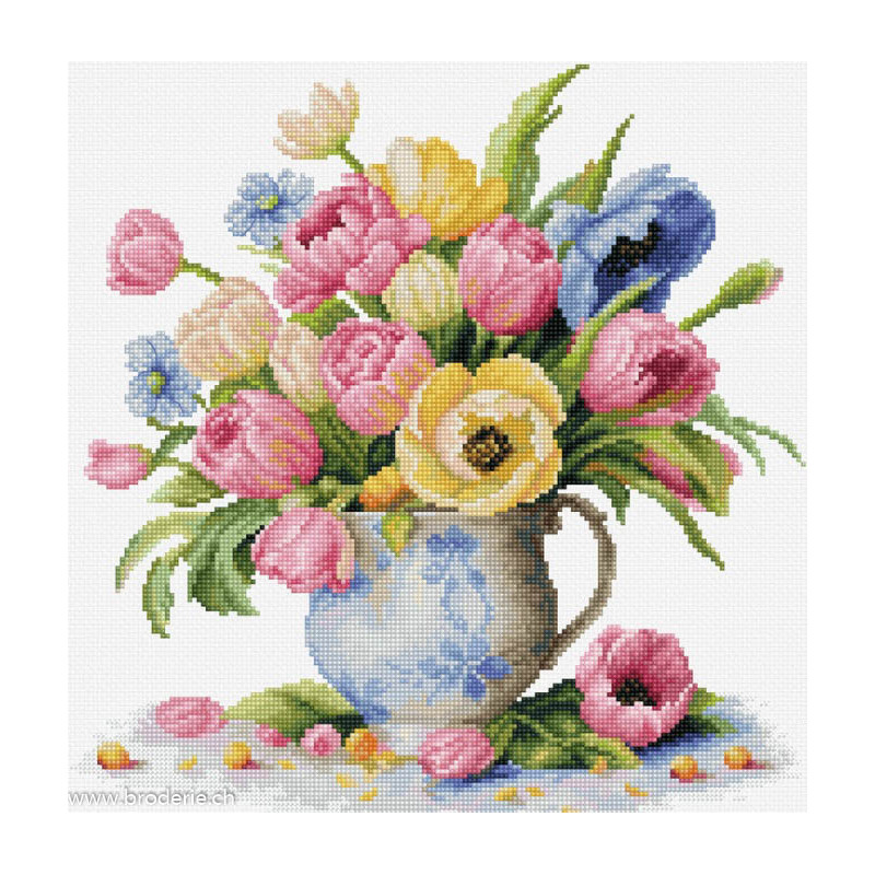 L'article 'Luca-S, kit Tulips Bouquet (LUCASB7034)' fait partie de notre assortiment depuis le 6 décembre 2024. Luca-S est une gamme de points de croix comptés qui nous vient de Moldavie. Il y a beaucoup de modèles de personnages, paysages, nature morte, ainsi que de sympathiques kits pour Noël, des sacs à confectionner, des carttes postales à broder. Pour beaucoup de modèle vous pouvez aussi avoir le kit en canevas 25ct, pour des demi-points à compter (10/cm), ce qui fait la broderie bien plus petite et fine dans la rubrique Kits - Luca-S (P). Les kits sont fournis principalement sur de la trame aïda 6.4 points/cm ou 7 points/cm, ou de l'étamine de Zweigart, les coussins avec de l'étamine 8 fils ou 10 fils/cm. Les fils sont de la maison Anchor.