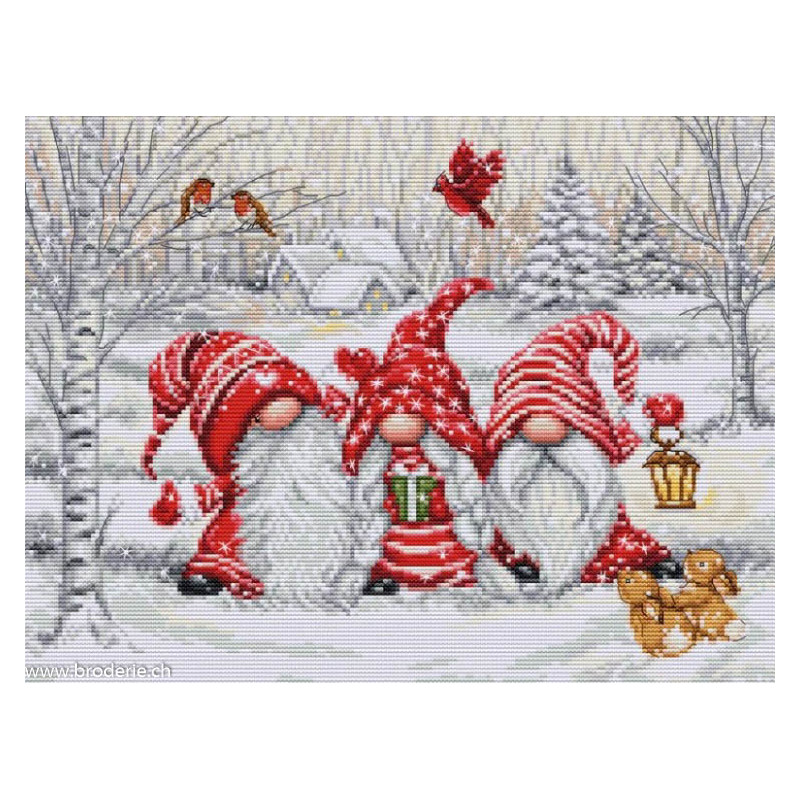 L'article 'Luca-S, kit Three Gnomes in Wood (LUCASBU5050)' fait partie de notre assortiment depuis le 18 décembre 2024. Luca-S est une gamme de points de croix comptés qui nous vient de Moldavie. Il y a beaucoup de modèles de personnages, paysages, nature morte, ainsi que de sympathiques kits pour Noël, des sacs à confectionner, des carttes postales à broder. Pour beaucoup de modèle vous pouvez aussi avoir le kit en canevas 25ct, pour des demi-points à compter (10/cm), ce qui fait la broderie bien plus petite et fine dans la rubrique Kits - Luca-S (P). Les kits sont fournis principalement sur de la trame aïda 6.4 points/cm ou 7 points/cm, ou de l'étamine de Zweigart, les coussins avec de l'étamine 8 fils ou 10 fils/cm. Les fils sont de la maison Anchor.