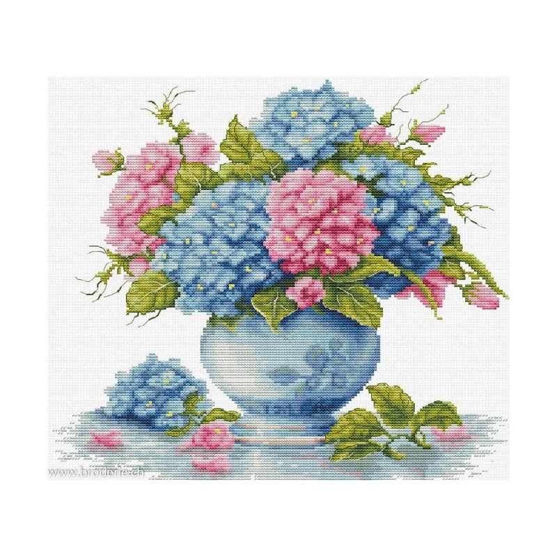 L'article 'Luca-S, kit Vase with Hydrangea (LUCASB7033)' fait partie de notre assortiment depuis le 18 décembre 2024. Luca-S est une gamme de points de croix comptés qui nous vient de Moldavie. Il y a beaucoup de modèles de personnages, paysages, nature morte, ainsi que de sympathiques kits pour Noël, des sacs à confectionner, des carttes postales à broder. Pour beaucoup de modèle vous pouvez aussi avoir le kit en canevas 25ct, pour des demi-points à compter (10/cm), ce qui fait la broderie bien plus petite et fine dans la rubrique Kits - Luca-S (P). Les kits sont fournis principalement sur de la trame aïda 6.4 points/cm ou 7 points/cm, ou de l'étamine de Zweigart, les coussins avec de l'étamine 8 fils ou 10 fils/cm. Les fils sont de la maison Anchor.