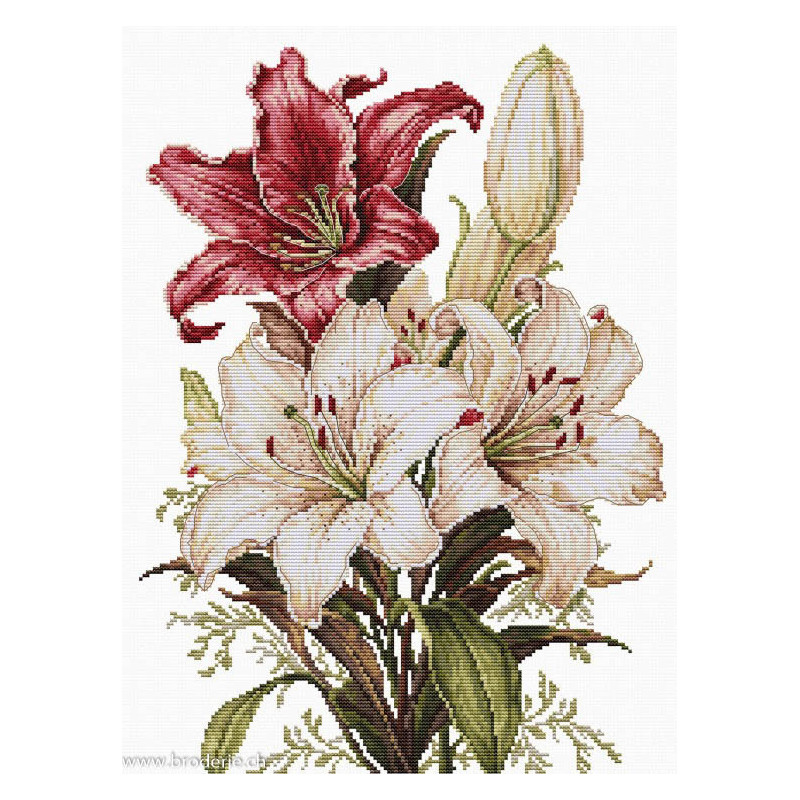 L'article 'Luca-S, kit The Scent of Lilies (LUCASB7054)' fait partie de notre assortiment depuis le 3 novembre 2025. Luca-S est une gamme de points de croix comptés qui nous vient de Moldavie. Il y a beaucoup de modèles de personnages, paysages, nature morte, ainsi que de sympathiques kits pour Noël, des sacs à confectionner, des carttes postales à broder. Pour beaucoup de modèle vous pouvez aussi avoir le kit en canevas 25ct, pour des demi-points à compter (10/cm), ce qui fait la broderie bien plus petite et fine dans la rubrique Kits - Luca-S (P). Les kits sont fournis principalement sur de la trame aïda 6.4 points/cm ou 7 points/cm, ou de l'étamine de Zweigart, les coussins avec de l'étamine 8 fils ou 10 fils/cm. Les fils sont de la maison Anchor.