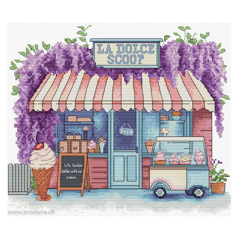 Luca-S, kit Ice Cream Scoop (art. LUCASB1428). Dimensions: 24 x 20 cm. Trame: Aïda 6.4 pts. Trame blanche.