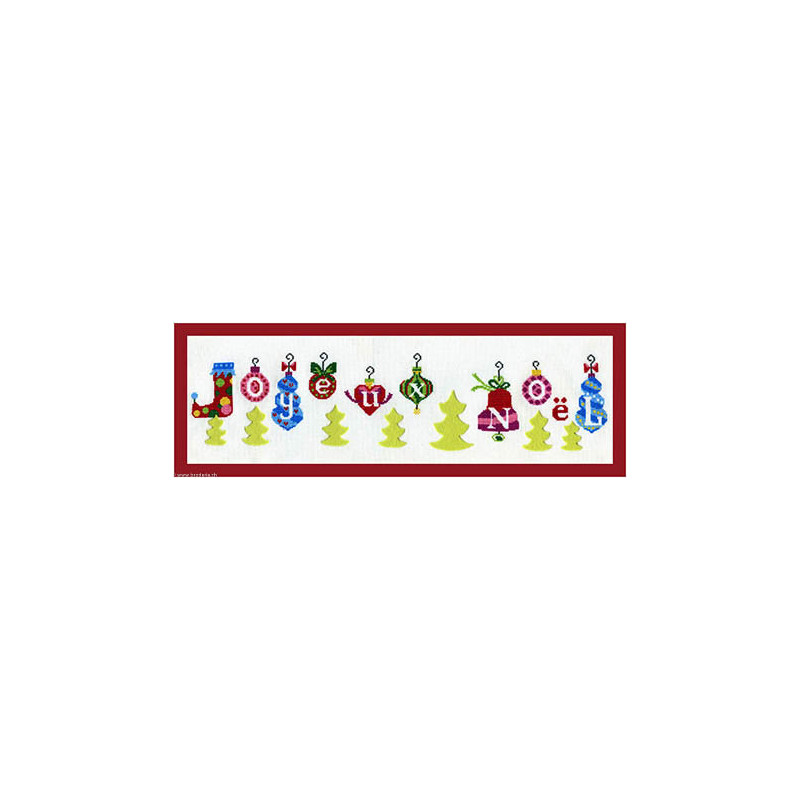 Marie Coeur, kit Joyeux Noël (art. MC1120-4608). Dimensions: 55 x 25 cm. Trame: Aïde 7 pts. Points utilisés: point de croix. Livré avec feutrine verte.
