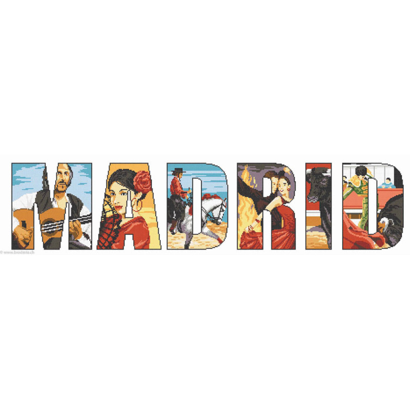 Marie Coeur, kit Madrid (art. MC1140-4856). Dimensions: 75 x 25 cm. Trame: Aïde 7 pts. Dans la même série d'autres villes et pays, Paris, Londres, Venise, Tokyo, Moscou, Québec, New York....