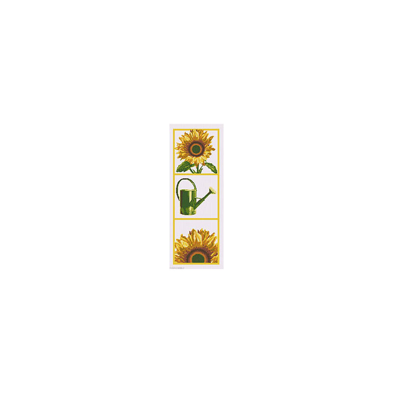 Marie Coeur, kit Tournesols (art. MC1966-4681A). Dimensions: 50 x 20 cm. Trame: Aïde 7 pts. Points utilisés: point de croix. Aussi disponible sur trame colorée sous référence 1706-4681B, autre modèle tournesol sous 1966-4680.