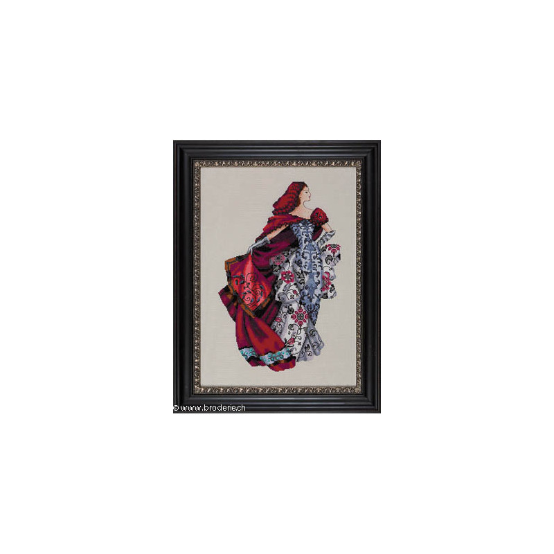 L'article 'Mirabilia, grille Dame en rouge (MD128)' fait partie de notre assortiment depuis le 20 août 2013. Mirabilia est un très belle gamme américaine de grands modèles de points de croix comptés, dessins créés par Nora Corbett. Ils représentent essentiellement des fées, elfes et élégantes dames. Presque chaque modèle nécessite des perles de la maison Mill Hill et parfois des fils Kreinik et/ou Caron. Nous vous obtenons rapidement aussi ces accessoires s'ils ne sont pas de stock. Pour l'instant, nous avons précisé sur le site les perles et fils nécessaires aux modèles de stock. Pour les autres, en attendant que nous le fassions, vous trouvez facilement ces indications sur www.mirabilia.com en recherchant le numéro du modèle. Nous vous communiquons volontiers une fourchette de prix pour les accessoires. Merci de faire attention à ce "détail" car il n'en est plus un lorsqu'il y a plusieurs paquets de perles, plusieurs fils différents ... et cela doit être pris en compte dans le prix de revient ... Fiche technique : points de croix - quelques demi-points, perles et fils métallisés. Pas de difficulté particulière ... mais quelques modèles sont complexes par la quantité de perles et les fils métallisés, et demandent un fin doigté. La trame utilisée le plus souvent est le lin 11 fils/cm, et sa teinte bien choisie rehaussera le modèle.