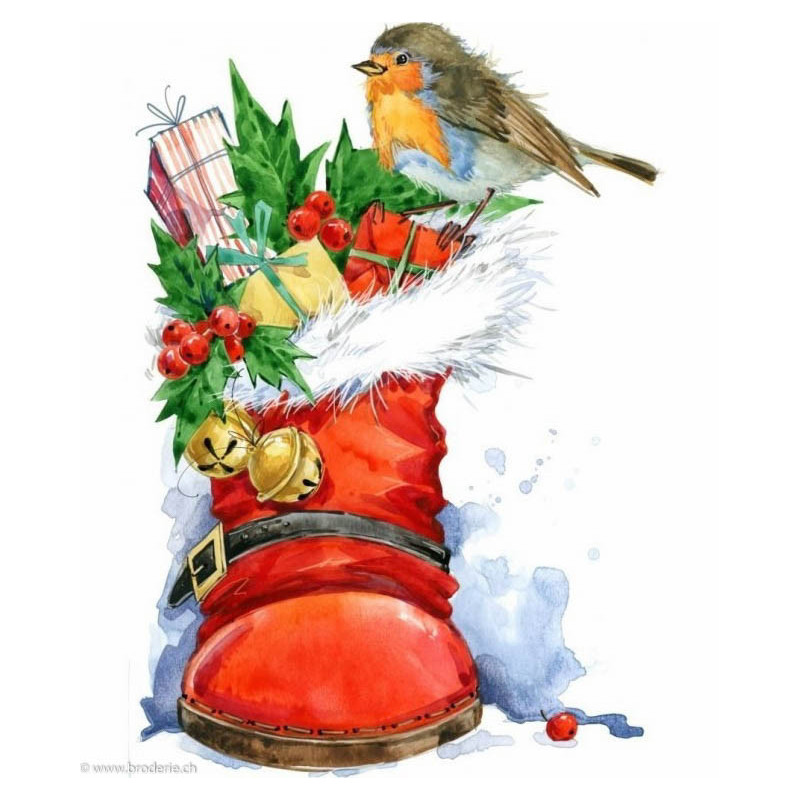 Collection d'Art, kit diamant Christmas bird (art. CADE7045). Dimensions: 27 x 38 cm. Kit comprenant la toile adhésive, les strass carrés emballés dans des sachets individuels et numérotés aux références des coloris de DMC, une pince, un stylo et sa colle, 2 réceptables et les explications.Toute la surface du tableau est à recouvrir de strass. ATTENTION: ce n'est pas une broderie, il n'y a ni fil ni aiguille, mais un collage comme une mosaïque.