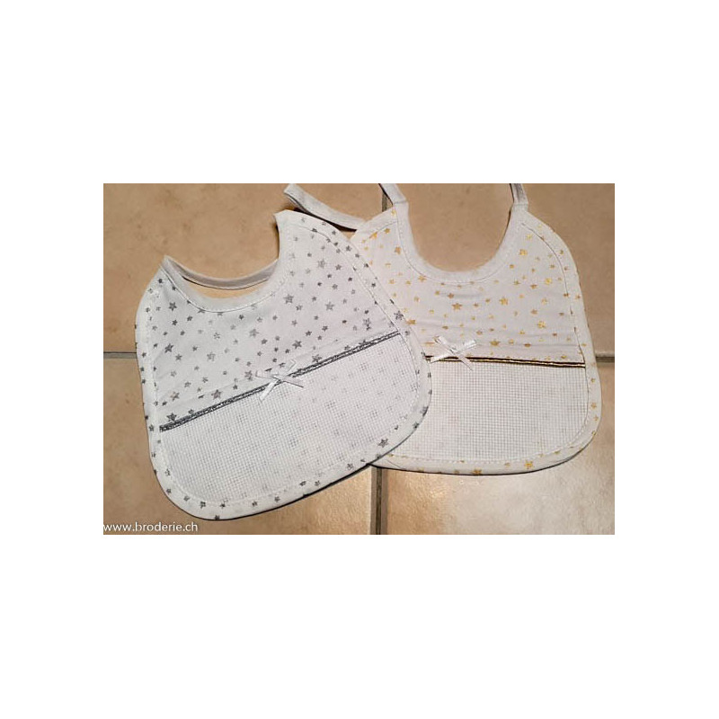 Ricami, petit bavoir Noël avec étoiles et lurex argenté (art. NA00224.30). Petit bavoir de 17cm sur 17 environ avec une bande à broder 5.5 pointscm blanche de 33 points de haut, à gauche sur la photo..