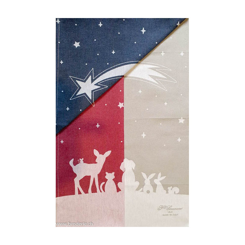 Graziano, Linge de cuisine imprimé Ciel étoilé, bleu foncé (art. CU6400). Dimensions: 40 x 75 cm. Coloris DMC correspondant ..., en haut à gauche sur la photo, peut être brodé par du surpiquage des motifs, en points arrière, de tige ou bouclette.