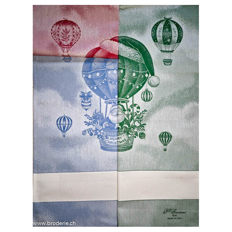 Graziano, Linge de cuisine vert père-noël Montgolfières (art. CU6525). Dimensions: 60 x 75 cm. Linge 100 % coton, avec une bande à broder 5.5 points/cm de 46 point de haut, largeur 42cm, à droite sur la photo, coloris DMC correspondant 699.