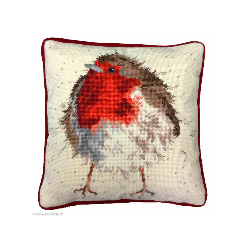 Bothy Threads, kit canevas peint Jolly Robin (art. BOXTHD5). Dimensions: 35 x 35 cm. Points utilisés: demi-point. Créations de Hannah Dale, canevas imprimé avec laine Anchor, dos de coussin non fournis, dans la même série THD et numéro, 4.5 points/cm.