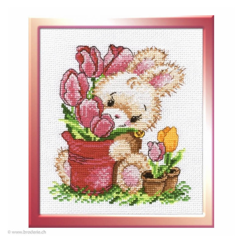 Oven, kit Rabbit with Tulips (art. OV715). Dimensions: 13 x 16 cm. Trame: Aïda 5.5 pts/cm blanc. Kit Contains: Aida Canvas White N14 ,PNK Kirov Threads 15 Colours, needle for cross stitch and instruction (Russian & English) Size of the work 13*16 ñì.