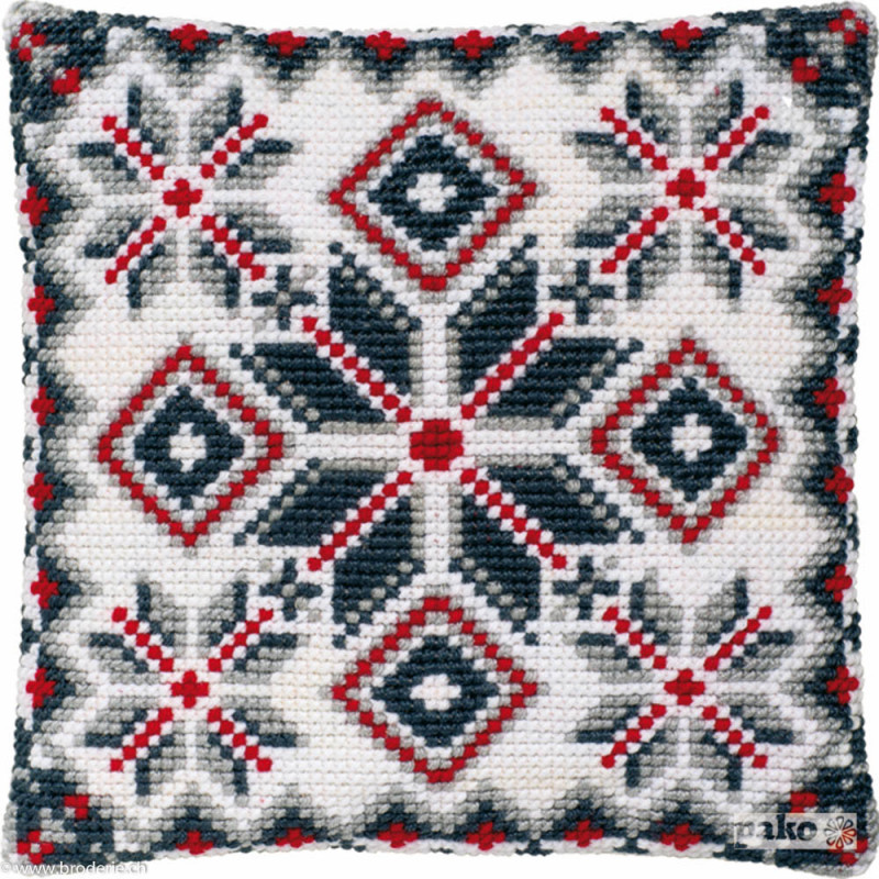 Pako, kit coussin au point de croix Géométrie 1 (art. PA003.266). Dimensions: 40 x 40 cm. Canevas peint 1,8 croix/cm, le fond n'est pas fourni pour le montage, n'est pas vendu hors de Suisse. Autre modèles sous réf 003.267.