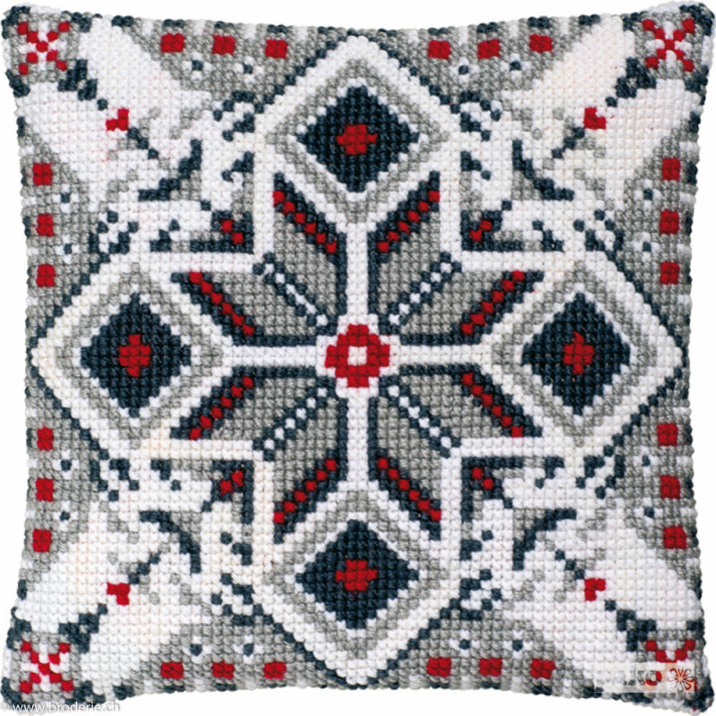 Pako, kit coussin au point de croix Géométrie 2 (art. PA003.267). Dimensions: 40 x 40 cm. Canevas peint 1,8 croix/cm, le fond n'est pas fourni pour le montage, n'est pas vendu hors de Suisse. Autre modèle sous réf 003.266.