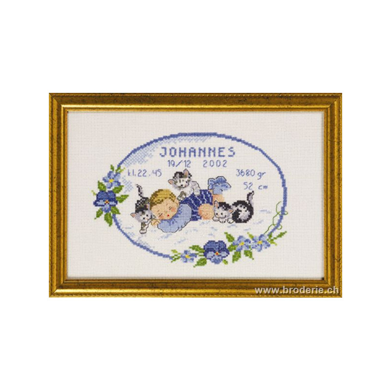 L'article 'Permin, kit naissance "Johannes" (PE12-3604)' fait partie de notre assortiment depuis le 21 décembre 2006. Permin of Copenhagen est une gamme qui propose de beaux kits de broderie depuis plus de 100 ans. Une belle gamme de broderie de points de croix comptés, de nappes imprimées et de tapisseries aussi. Vous trouverez dans la collection Permin of Copenhagen beaucoup de paysages (notamment aussi en teintes sépia), des reprodutions d'anciens marquoirs et abécédaires antiques (sampler antiques), et de belles broderies d'animaux, et beaucoup de broderie pour Noël (calendriers de l'Avant, Père-Noël ). Sur le site vous avez aussi sous la rubrique minikit tous les petits kits de Noël ou autres relativement vite réalisés et aussi des kits faciles pour commencer, sur une trame Aïda 3.2 points/cm (kit facile à mettre dans la rubtique recherche. Fiche technique : merci de bien regarder ce que vous désirez, points de croix comptés (parfois les kits sont disponibles sur aïda ou lin), quelques tapisseries, nappes. Les kits prévus spécialement pour les enfants qui commencent le point de croix sont sous la rubrique "kits pour enfants- points de croix compté".