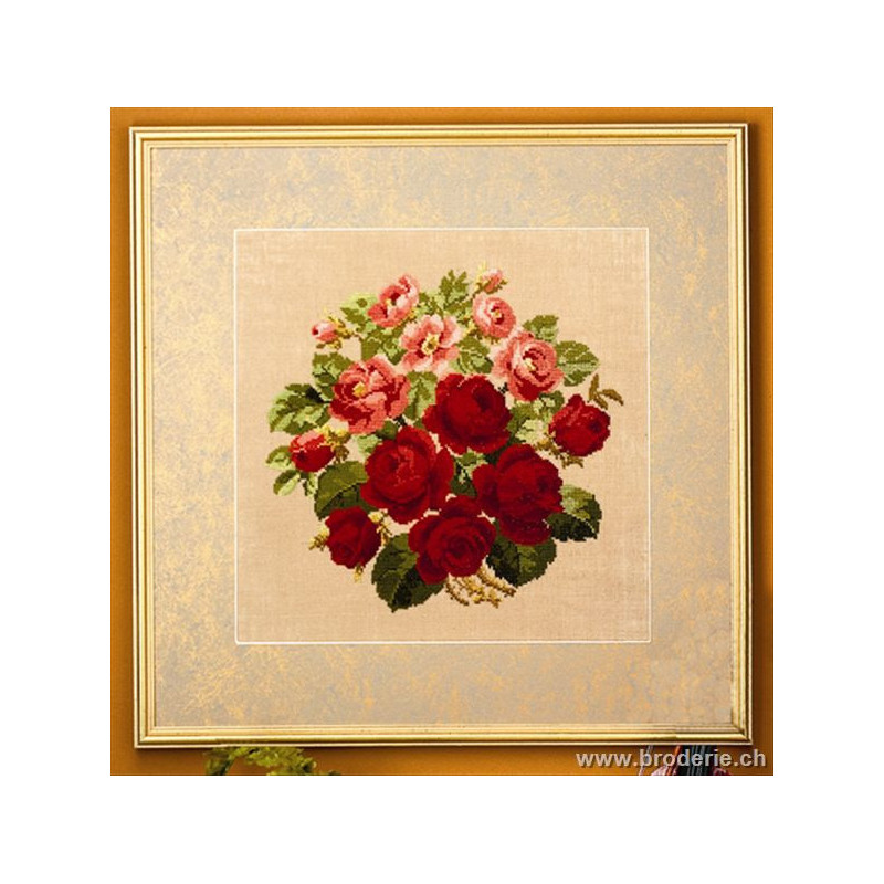 L'article 'Permin, kit le bouquet de roses (PE70-5143)' fait partie de notre assortiment depuis le 1 mai 2008. Permin of Copenhagen est une gamme qui propose de beaux kits de broderie depuis plus de 100 ans. Une belle gamme de broderie de points de croix comptés, de nappes imprimées et de tapisseries aussi. Vous trouverez dans la collection Permin of Copenhagen beaucoup de paysages (notamment aussi en teintes sépia), des reprodutions d'anciens marquoirs et abécédaires antiques (sampler antiques), et de belles broderies d'animaux, et beaucoup de broderie pour Noël (calendriers de l'Avant, Père-Noël ). Sur le site vous avez aussi sous la rubrique minikit tous les petits kits de Noël ou autres relativement vite réalisés et aussi des kits faciles pour commencer, sur une trame Aïda 3.2 points/cm (kit facile à mettre dans la rubtique recherche. Fiche technique : merci de bien regarder ce que vous désirez, points de croix comptés (parfois les kits sont disponibles sur aïda ou lin), quelques tapisseries, nappes. Les kits prévus spécialement pour les enfants qui commencent le point de croix sont sous la rubrique "kits pour enfants- points de croix compté".