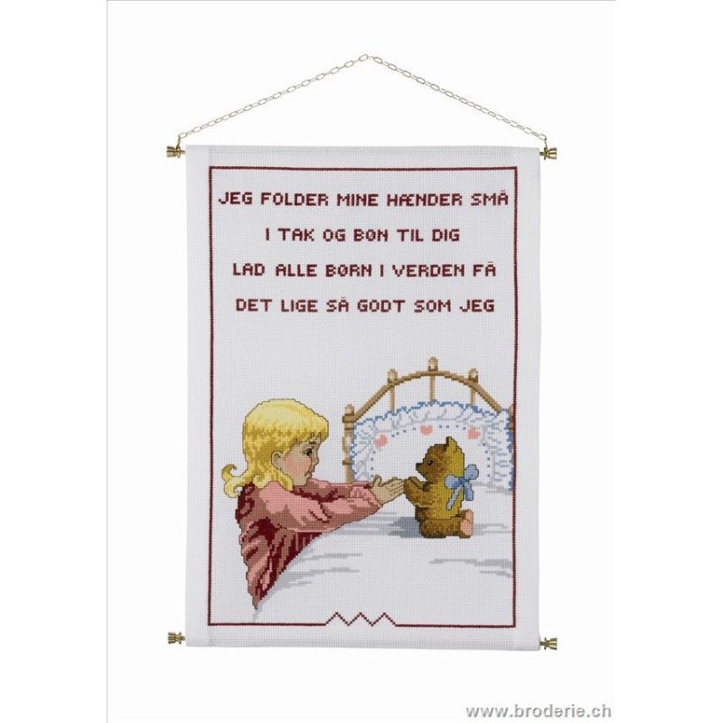L'article 'Permin, kit Prière du soir fille (PE90-9120)' fait partie de notre assortiment depuis le 20 mai 2009. Permin of Copenhagen est une gamme qui propose de beaux kits de broderie depuis plus de 100 ans. Une belle gamme de broderie de points de croix comptés, de nappes imprimées et de tapisseries aussi. Vous trouverez dans la collection Permin of Copenhagen beaucoup de paysages (notamment aussi en teintes sépia), des reprodutions d'anciens marquoirs et abécédaires antiques (sampler antiques), et de belles broderies d'animaux, et beaucoup de broderie pour Noël (calendriers de l'Avant, Père-Noël ). Sur le site vous avez aussi sous la rubrique minikit tous les petits kits de Noël ou autres relativement vite réalisés et aussi des kits faciles pour commencer, sur une trame Aïda 3.2 points/cm (kit facile à mettre dans la rubtique recherche. Fiche technique : merci de bien regarder ce que vous désirez, points de croix comptés (parfois les kits sont disponibles sur aïda ou lin), quelques tapisseries, nappes. Les kits prévus spécialement pour les enfants qui commencent le point de croix sont sous la rubrique "kits pour enfants- points de croix compté".