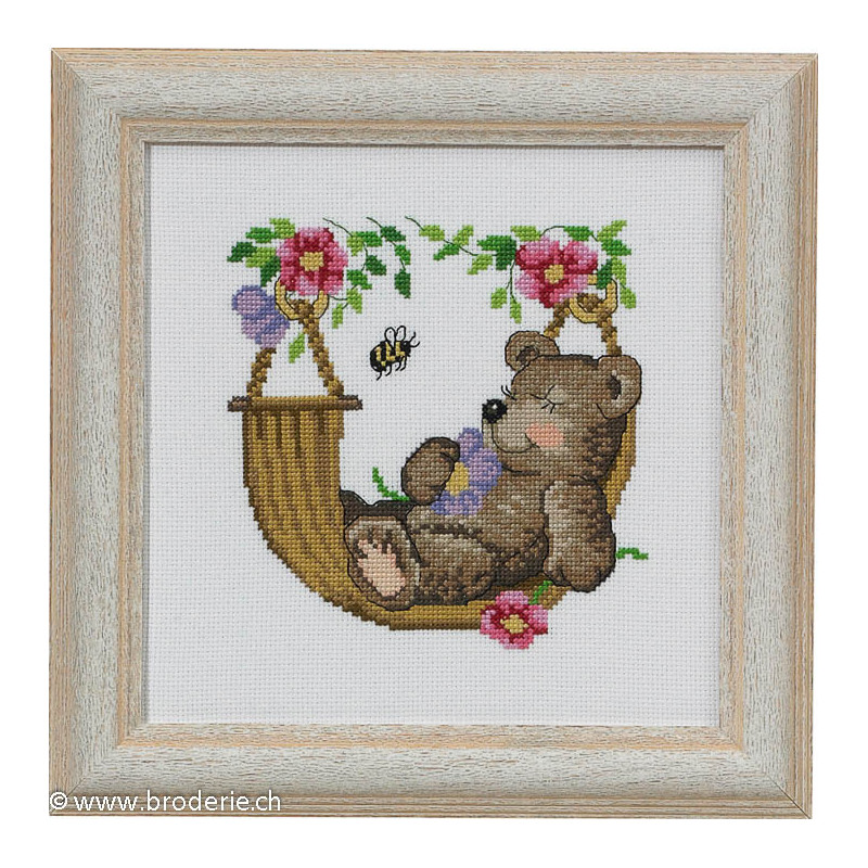 L'article 'Permin, kit ourson dans un hamac (PE13-3354)' fait partie de notre assortiment depuis le 4 janvier 2014. Permin of Copenhagen est une gamme qui propose de beaux kits de broderie depuis plus de 100 ans. Une belle gamme de broderie de points de croix comptés, de nappes imprimées et de tapisseries aussi. Vous trouverez dans la collection Permin of Copenhagen beaucoup de paysages (notamment aussi en teintes sépia), des reprodutions d'anciens marquoirs et abécédaires antiques (sampler antiques), et de belles broderies d'animaux, et beaucoup de broderie pour Noël (calendriers de l'Avant, Père-Noël ). Sur le site vous avez aussi sous la rubrique minikit tous les petits kits de Noël ou autres relativement vite réalisés et aussi des kits faciles pour commencer, sur une trame Aïda 3.2 points/cm (kit facile à mettre dans la rubtique recherche. Fiche technique : merci de bien regarder ce que vous désirez, points de croix comptés (parfois les kits sont disponibles sur aïda ou lin), quelques tapisseries, nappes. Les kits prévus spécialement pour les enfants qui commencent le point de croix sont sous la rubrique "kits pour enfants- points de croix compté".