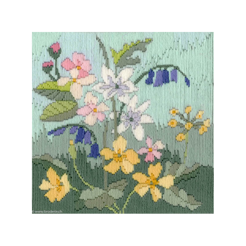 Derwentwater, kit Long Stitch - Seasons-Spring (art. DWLSS01). Dimensions: 20 x 20 cm. Autres saisons sous DWLSS02, 03 et 04. Broderie sur canevas peint 22ct. Les contours des surfaces de couleurs sont délimités en noir. Avec du coton mouliné pour broder.