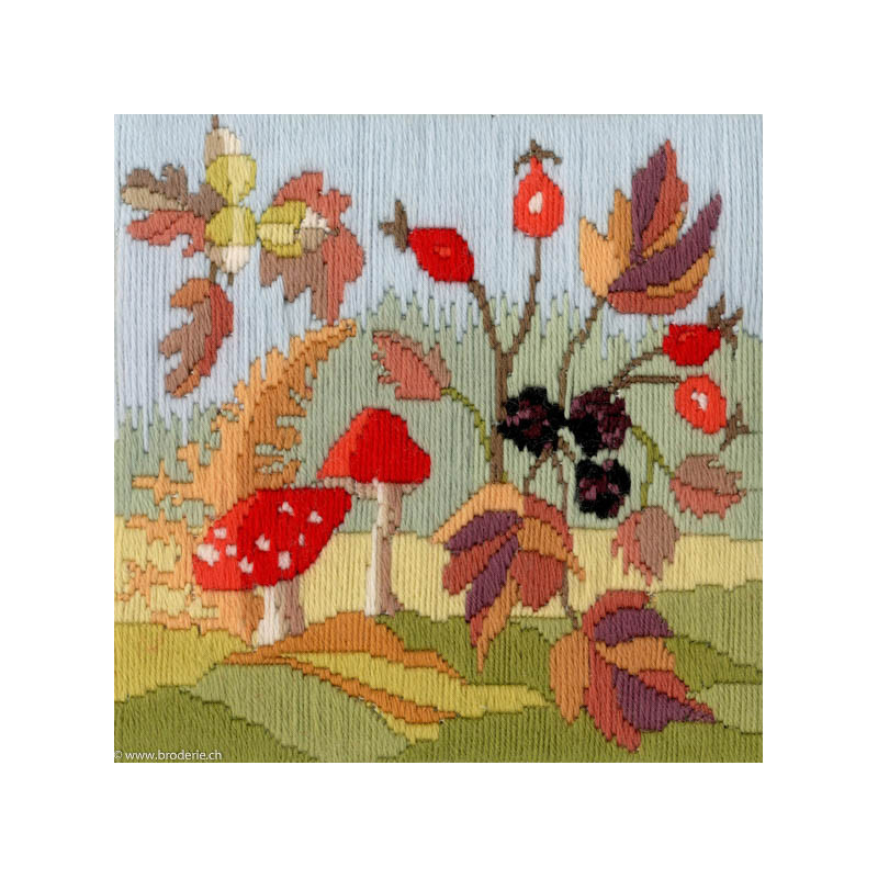 Derwentwater, kit Long Stitch - Seasons-Automn (art. DWLSS03). Dimensions: 20 x 20 cm. Autres saisons sous DWLSS02, 01 et 04. Broderie sur canevas peint 22ct. Les contours des surfaces de couleurs sont délimités en noir. Avec du coton mouliné pour broder.