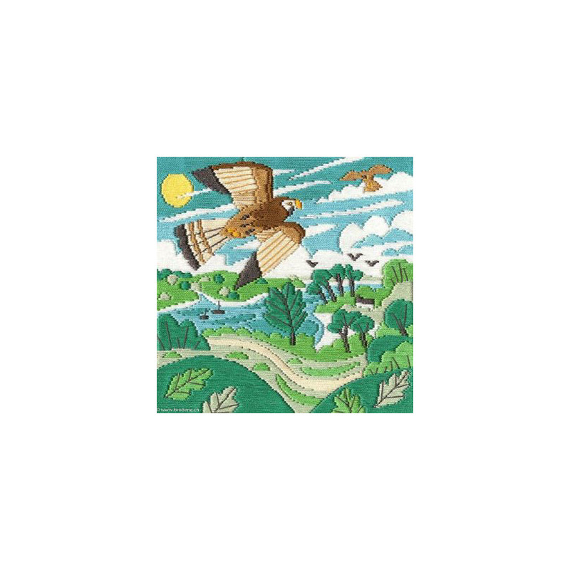 Bothy Thread, kit Long Stitch - Kestrels (art. BOSSMJ4). Dimensions: 16 x 16 cm. Broderie sur canevas peint 22ct. Création de Matt Johnson. Les contours des surfaces de couleurs sont délimités en noir. Avec du coton mouliné pour broder. Dans la même série BOSSMJ et numéro.