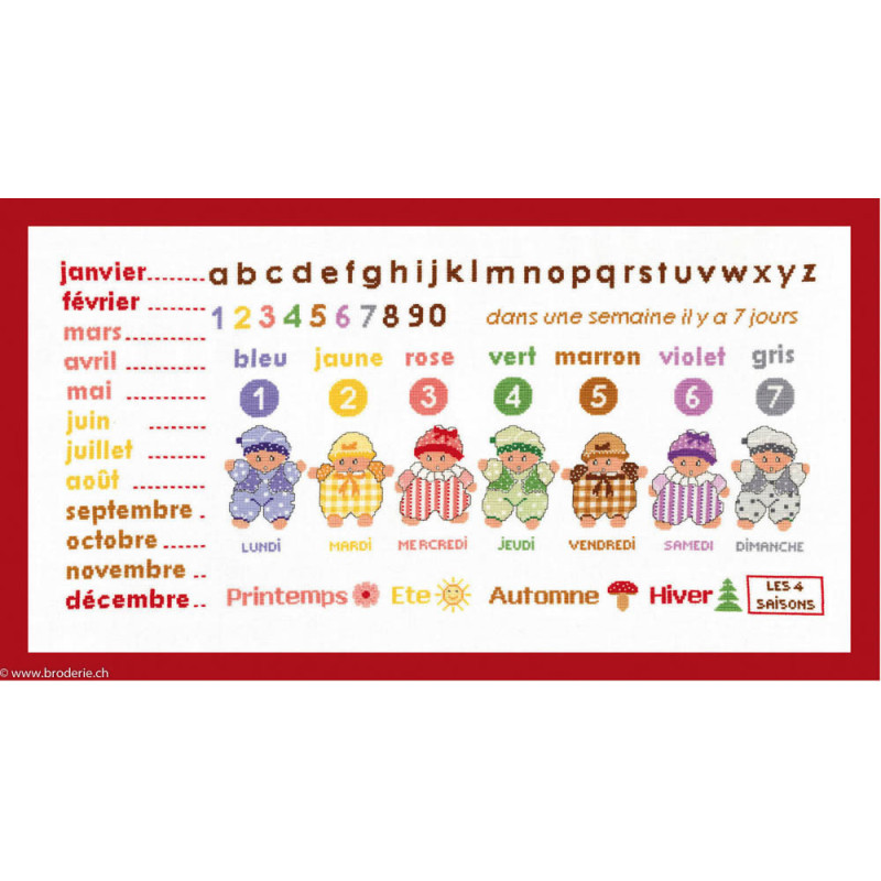 L'article 'Princesse, kit semainier les jours en couleurs (PR7206)' fait partie de notre assortiment depuis le 2 décembre 2015. La gamme Princesse est une gamme de kits de broderie, et vous trouvez ici les kits de points de croix comptéx qui ne présentent pas de difficulté particulière. Très souvent vous avez le choix entre une trame classique et une trame colorée, avec un fond ou est imprimé une partie du motif ou des notes ou des flocons par exemple , et une seule partie du dessin est à broder. Dans la rubrique broderie traditionnele - tableaux, coussins et divers vous trouverez les kits de Princesse ou le dessin à broder est imprimé, soit des croix ou d'autres points.