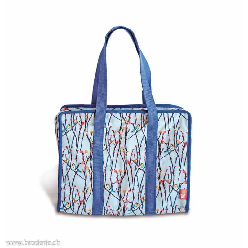 Prym, sac à ouvrage Branches et oiseaux (art. PR612.111). 34x26x9.5cm, avbec multiples poches à l'intérieur. (7 poches, avec fermetures éclairs, et un endroit avec élsatique pour tenir ciseaux stylos et petit matériel (les poches s'ouvrent comme un classeur) et une poche plus grande dessous.