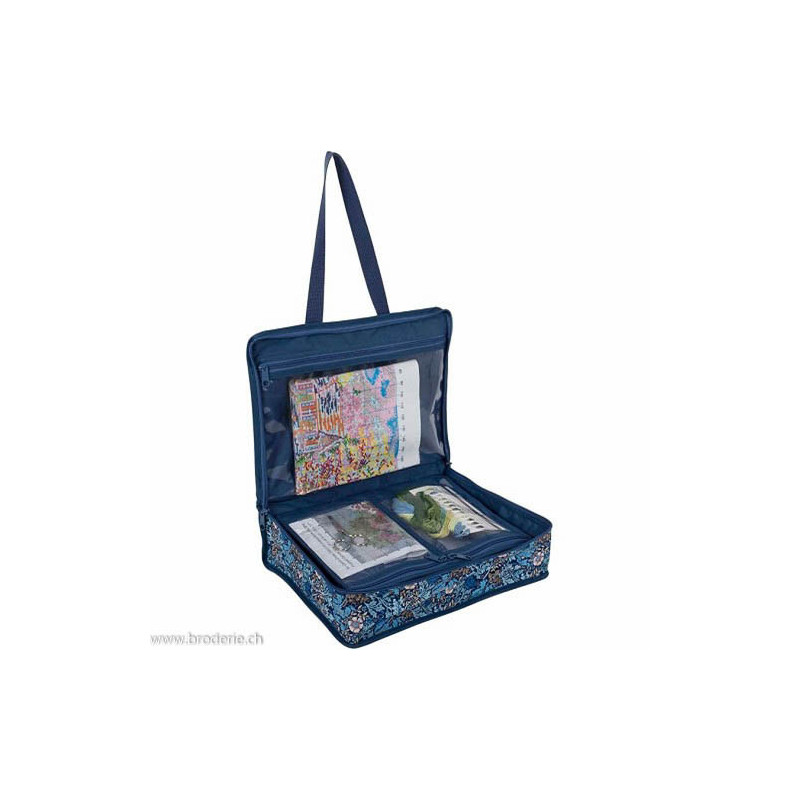 Hobby Gift, sac à ouvrage bleu avec fleurs stylisées (art. HGPCS674). 34 x 26x 9.5cm, avec multiples poches à l'intérieur. (7 poches, avec fermetures éclairs, et un endroit avec élastique pour tenir ciseaux stylos et petit matériel (les poches s'ouvrent comme un classeur) et une poche plus grande dessous.