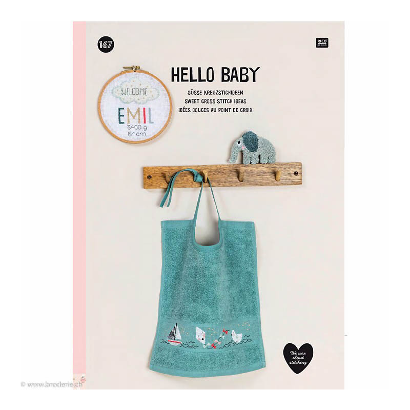 L'article 'Rico, catalogue de points de croix Hello Baby (RICO167)' fait partie de notre assortiment depuis le 5 septembre 2019. Ici sont répertoriés les catalogues Rico proposés à la vente. Vous en voyez la page de couverture. Nous pouvons aussi vous fournir tous les articles des divers catalogues sur demande (suspenses, nappes, bandes à broder ... etc), pas forcéement sur notre site.