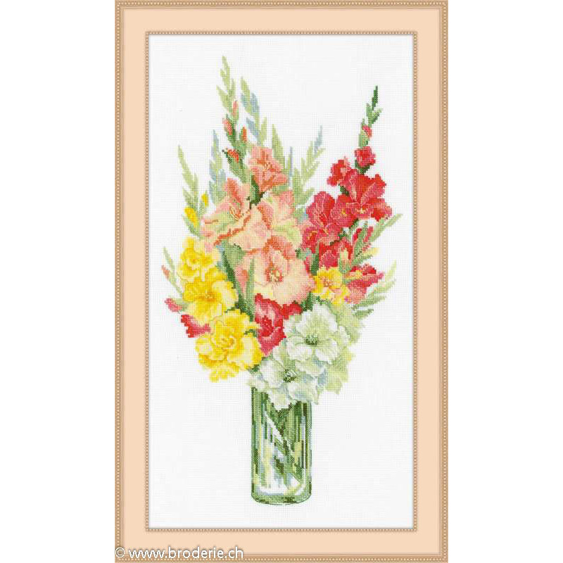 L'article 'Riolis, kit Bouquet of Gladioli (RI1446)' fait partie de notre assortiment depuis le 22 octobre 2014. La gamme Riolis nous vient de Lituanie et propose une grande diversité de kits de points de croix comptés : paysages, animaux, saisons, modèles modernes et rétros, kits faciles et avec perles, reproduction de tableaux de maîtres. Sa particularité est essentiellement d'utiliser pour la plupart de ses kits de la laine très fine, idéale pour donner un aspect soyeux à la broderie. Pensez à bien regarder dans "plus de détails" du kit qui vous intéresse si le kit est avec laine ou mouliné. Tous les kits sont livrés avec de l'aïda 5,5 points/cm (Aïda 14) ou plus large (marqué aïda 10). il est cependant facile changer de trame, sauf pour les quelques kits ou l'aïda est imprimé par un dessin dans le fonds (références commençant par RIPT). Les kits mentionnés comme "facile" le sont car ils sont brodés sur de l'aïda 4.5 points/cm, mais ne sont pas conseillés pour un premier ouvrage d'enfant, car la plupart sont livrés avec de la lainev :-) Explication en russe et en anglais