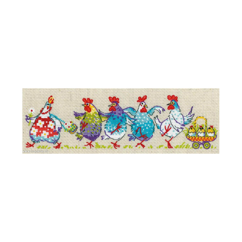 Riolis, kit Cluck-cluck?!!! (art. RI2266). Dimensions: 24 x 8 cm. Trame: Aïda 5.5 pts. Trame chinée, avec cotons Anchor.