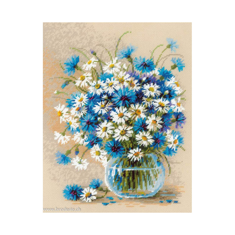 L'article 'Riolis, kit Daisies and Cornflowers (RI2249)' fait partie de notre assortiment depuis le 22 avril 2025. La gamme Riolis nous vient de Lituanie et propose une grande diversité de kits de points de croix comptés : paysages, animaux, saisons, modèles modernes et rétros, kits faciles et avec perles, reproduction de tableaux de maîtres. Sa particularité est essentiellement d'utiliser pour la plupart de ses kits de la laine très fine, idéale pour donner un aspect soyeux à la broderie. Pensez à bien regarder dans "plus de détails" du kit qui vous intéresse si le kit est avec laine ou mouliné. Tous les kits sont livrés avec de l'aïda 5,5 points/cm (Aïda 14) ou plus large (marqué aïda 10). il est cependant facile changer de trame, sauf pour les quelques kits ou l'aïda est imprimé par un dessin dans le fonds (références commençant par RIPT). Les kits mentionnés comme "facile" le sont car ils sont brodés sur de l'aïda 4.5 points/cm, mais ne sont pas conseillés pour un premier ouvrage d'enfant, car la plupart sont livrés avec de la lainev :-) Explication en russe et en anglais