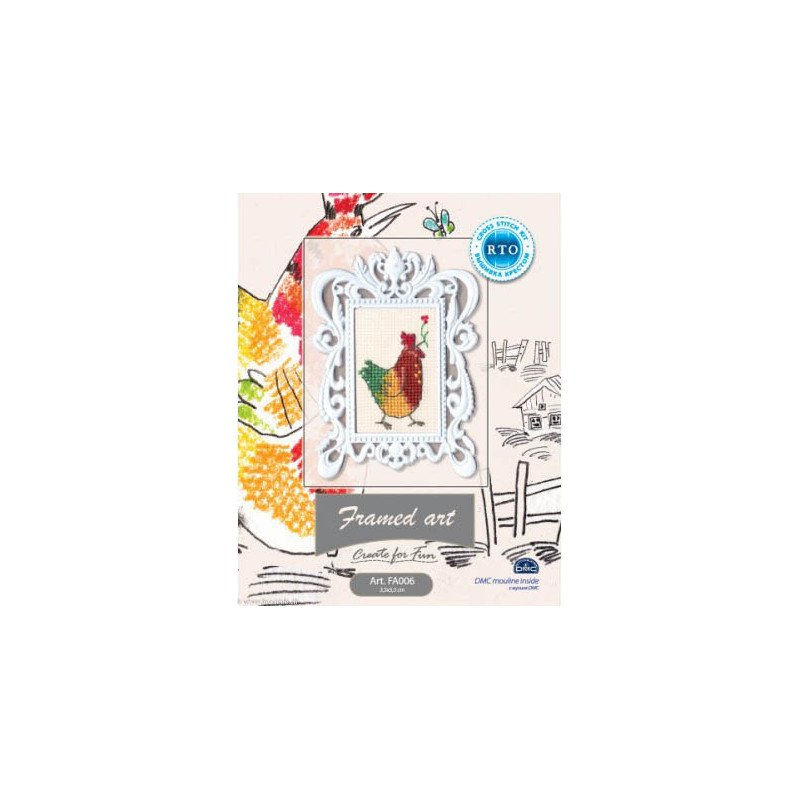 L'article 'RTO, kit miniature avec cadre, Poule (RTOFA006)' fait partie de notre assortiment depuis le 30 mars 2016. Voilà une sympathique gamme de points de croix comptés, tous livrés en kit aur aïda. RTO nous vient d'Estonie et propose de ravissants kits sur pleins de sujets différents, allant des fleurs, aux animuax et tableaux rétro des années 60, et aussi bien des motifs rigolos avec des animaux. Lorsque un modèle comprends des "frères" du même style, les références sont notées dans le détail. Vous trouverez aussi plein de petits kits à 6.- et moins, idéeaux pour commencer le point de croix ... ou pour simplement avoir le motif et les cotons pour un modèle à broder sur autre support: pour cette recherche, mettez "RTO, petit kit " et vous les voyez rapidement. RTO propose ses kits avec le cotons mouliné DMC art 117. Explication dans les kits en russe et en anglais.