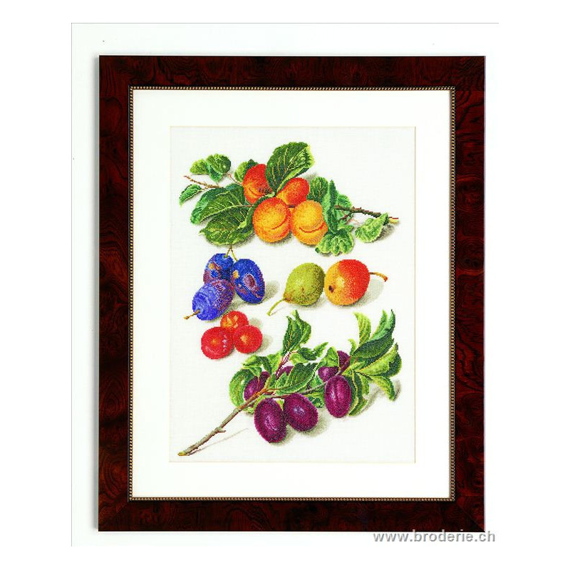 L'article 'Thea Gouverneur, kit Fruits (G3062)' fait partie de notre assortiment depuis le 4 septembre 2009. La gamme Thea Gouverneur est une très belle et riche gamme hollandaise de points de croix comptés. Les kits proposés sur du lin sont tous disponibles sur aïda sur demande, au même tarif. La gamme propose de très grands tableaux à divers thèmes, notamment floraux, sportifs, et aussi de belles villes en couleurs. Vous trouverez aussi de véritables photos de fleurs et de fruits, cieux bleus ou orageux.