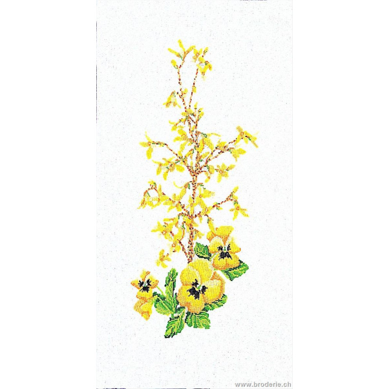 L'article 'Thea Gouverneur, kit Pensées jaunes et forsythia (G0822)' fait partie de notre assortiment depuis le 9 avril 2010. La gamme Thea Gouverneur est une très belle et riche gamme hollandaise de points de croix comptés. Les kits proposés sur du lin sont tous disponibles sur aïda sur demande, au même tarif. La gamme propose de très grands tableaux à divers thèmes, notamment floraux, sportifs, et aussi de belles villes en couleurs. Vous trouverez aussi de véritables photos de fleurs et de fruits, cieux bleus ou orageux.