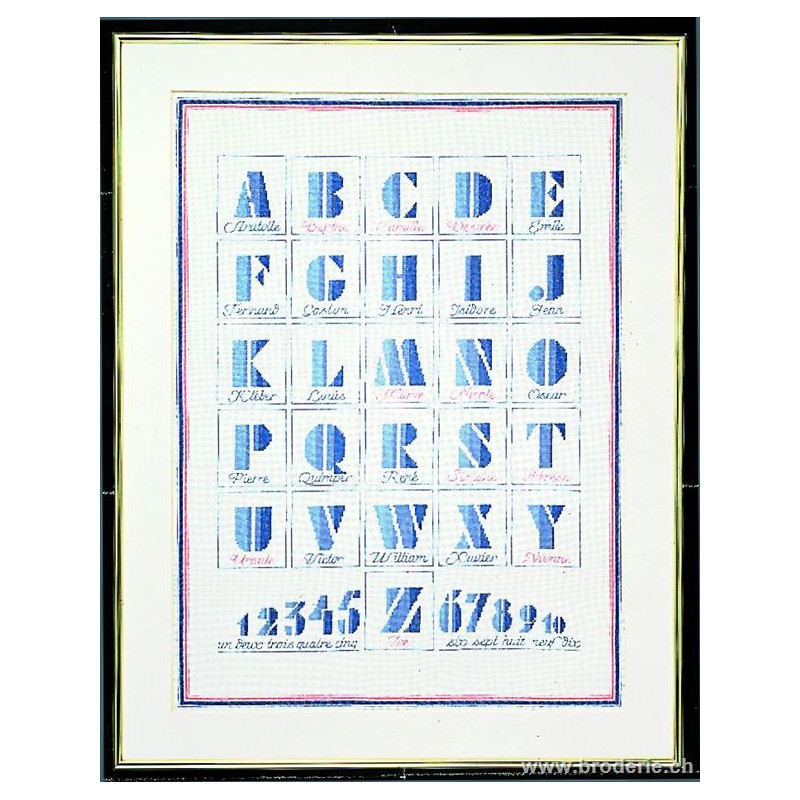 L'article 'Thea Gouverneur, kit abécédaire bleu et chiffres (G1089)' fait partie de notre assortiment depuis le 9 avril 2010. La gamme Thea Gouverneur est une très belle et riche gamme hollandaise de points de croix comptés. Les kits proposés sur du lin sont tous disponibles sur aïda sur demande, au même tarif. La gamme propose de très grands tableaux à divers thèmes, notamment floraux, sportifs, et aussi de belles villes en couleurs. Vous trouverez aussi de véritables photos de fleurs et de fruits, cieux bleus ou orageux.