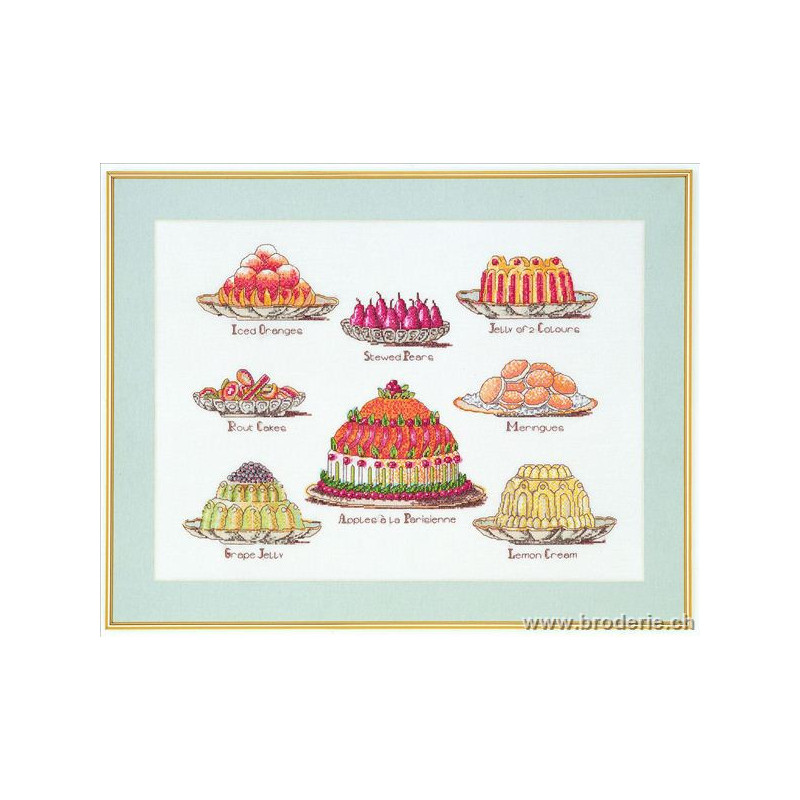 L'article 'Thea Gouverneur, kit les dessert (G2096)' fait partie de notre assortiment depuis le 9 avril 2010. La gamme Thea Gouverneur est une très belle et riche gamme hollandaise de points de croix comptés. Les kits proposés sur du lin sont tous disponibles sur aïda sur demande, au même tarif. La gamme propose de très grands tableaux à divers thèmes, notamment floraux, sportifs, et aussi de belles villes en couleurs. Vous trouverez aussi de véritables photos de fleurs et de fruits, cieux bleus ou orageux.