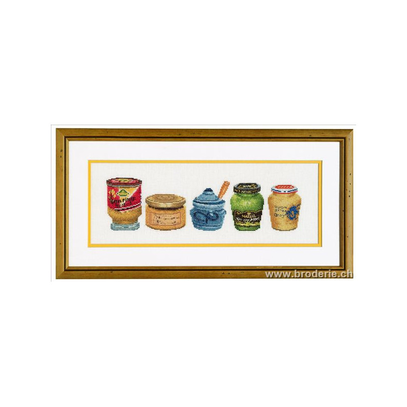 L'article 'Thea Gouverneur, kit les pots de moutarde (G3046)' fait partie de notre assortiment depuis le 9 avril 2010. La gamme Thea Gouverneur est une très belle et riche gamme hollandaise de points de croix comptés. Les kits proposés sur du lin sont tous disponibles sur aïda sur demande, au même tarif. La gamme propose de très grands tableaux à divers thèmes, notamment floraux, sportifs, et aussi de belles villes en couleurs. Vous trouverez aussi de véritables photos de fleurs et de fruits, cieux bleus ou orageux.