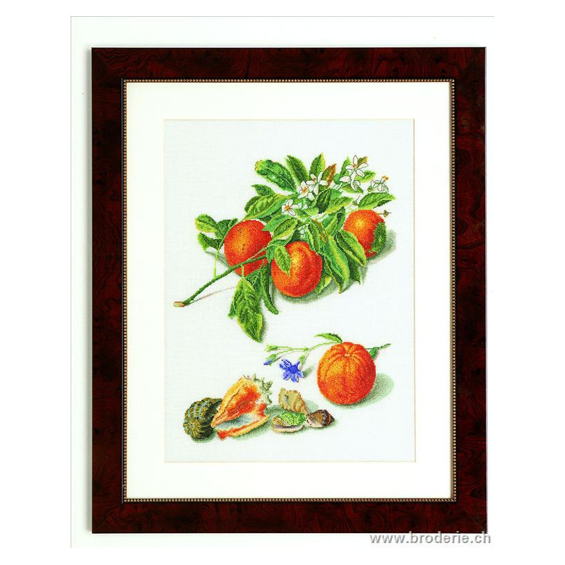 L'article 'Thea Gouverneur, kit branche d'oranger et coquillage (G3061)' fait partie de notre assortiment depuis le 9 avril 2010. La gamme Thea Gouverneur est une très belle et riche gamme hollandaise de points de croix comptés. Les kits proposés sur du lin sont tous disponibles sur aïda sur demande, au même tarif. La gamme propose de très grands tableaux à divers thèmes, notamment floraux, sportifs, et aussi de belles villes en couleurs. Vous trouverez aussi de véritables photos de fleurs et de fruits, cieux bleus ou orageux.