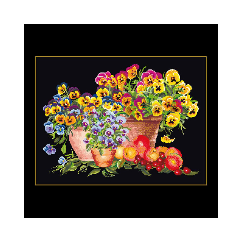 L'article 'Thea Gouverneur, kit pots de pensées et fruits (G2083.05)' fait partie de notre assortiment depuis le 9 juin 2011. La gamme Thea Gouverneur est une très belle et riche gamme hollandaise de points de croix comptés. Les kits proposés sur du lin sont tous disponibles sur aïda sur demande, au même tarif. La gamme propose de très grands tableaux à divers thèmes, notamment floraux, sportifs, et aussi de belles villes en couleurs. Vous trouverez aussi de véritables photos de fleurs et de fruits, cieux bleus ou orageux.