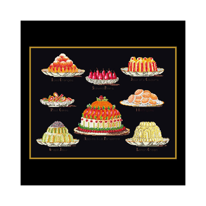 L'article 'Thea Gouverneur, kit les dessert (G2096.05)' fait partie de notre assortiment depuis le 9 juin 2011. La gamme Thea Gouverneur est une très belle et riche gamme hollandaise de points de croix comptés. Les kits proposés sur du lin sont tous disponibles sur aïda sur demande, au même tarif. La gamme propose de très grands tableaux à divers thèmes, notamment floraux, sportifs, et aussi de belles villes en couleurs. Vous trouverez aussi de véritables photos de fleurs et de fruits, cieux bleus ou orageux.
