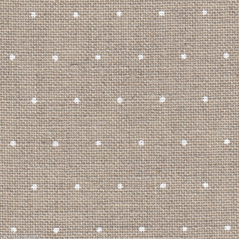 Zweigart, Lin Cashel 11 fils/cm mini-Dotz nature points blancs (art. 3281-1399). Largeur: 140 cm. Trame 100% lin, lavable en machine à 60°C, coloris correspondant DMC. Prix pour 10 cm, minimum à commander: 50 cm (indiquez 5 comme quantité pour 50 cm, 6 pour 60 cm, etc...).