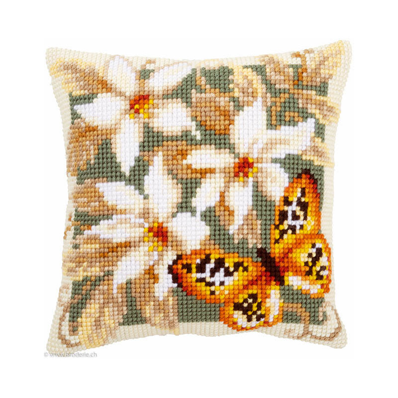 Vervaco, kit coussin fleur et papillon (art. PN0148254). Dimensions: 40 x 40 cm. dans la même série PN0146840 et PN0146841, canevas peint 1,8 croix/cm, le fond n'est pas fourni pour le montage, n'est pas vendu hors de Suisse.