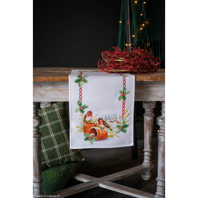 L'article 'Vervaco, Kit facile chemin de table Rouge-gorge (PN0147403)' fait partie de notre assortiment depuis le 15 novembre 2021. Vervaco est un fabricant belge de kits au point de croix, au point noué, aux points comptés, et propose aussi de sympathiques kits pour les enfants. Ils sont de réalisation relativement faciles : pas de quart de point, dessins et diagrammes très clairs, beaucoup de thèmes abordés (paysage , fleurs , mariage,et particulièrement kits de naissances, toises et Disney).