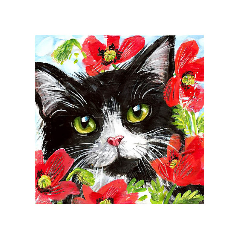 Wizardi, kit diamant Cat in Flowers (art. WIWD292). Dimensions: 20 x 20 cm. Kit complet de Broderie Diamant comprenant la toile adhésive imprimée à recouvrir de strass, les sachets de strass 'diamants' triés par couleurs, un stylet et sa cire, un réceptacle et les explications. La totalité de la surface est à recouvrir. ATTENTION, ce n'est pas une broderie, pas de fil ni d'aiguille, mais une mosaïque.