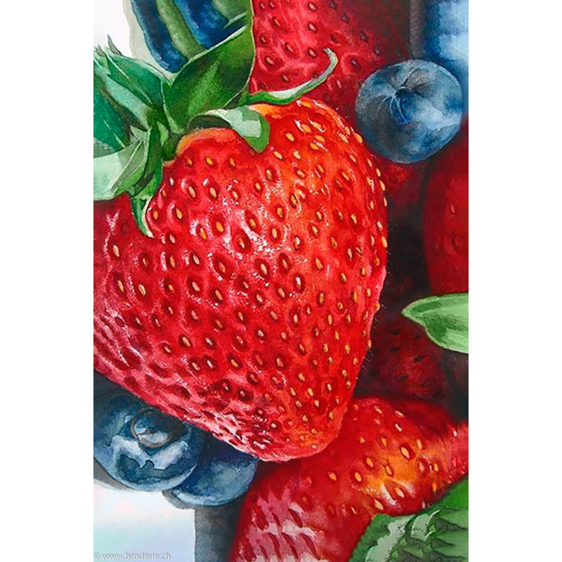 Wizardi, kit diamant Fresh Berries (art. WIWD050). Dimensions: 20 x 30 cm. Kit complet de Broderie Diamant comprenant la toile adhésive imprimée à recouvrir de strass, les sachets de strass 'diamants' triés par couleurs, un stylet et sa cire, un réceptacle et les explications. La totalité de la surface est à recouvrir. ATTENTION, ce n'est pas une broderie, pas de fil ni d'aiguille, mais une mosaïque.