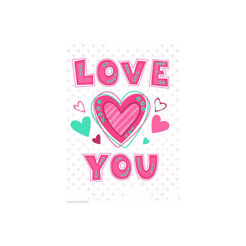 Wizardi, kit diamant Love You (art. WIWD2314). Dimensions: 27 x 38 cm. Kit complet de Broderie Diamant comprenant la toile adhésive imprimée à recouvrir de strass, les sachets de strass 'diamants' triés par couleurs, un stylet et sa cire, un réceptacle et les explications. La totalité de la surface est à recouvrir. ATTENTION, ce n'est pas une broderie, pas de fil ni d'aiguille, mais une mosaïque.