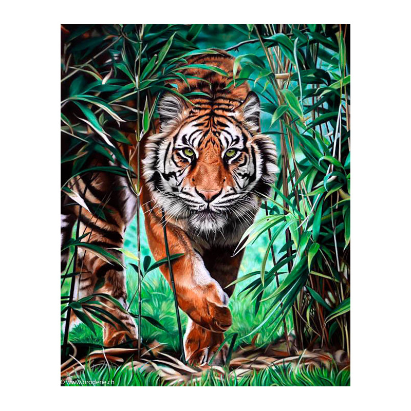 Wizardi, kit diamant Dangerous Tiger (art. WIWD310). Dimensions: 40 x 50 cm. Kit complet de Broderie Diamant comprenant la toile adhésive imprimée à recouvrir de strass, les sachets de strass 'diamants' carrrés triés par couleurs, un stylet et sa cire, un réceptacle et les explications. La totalité de la surface est à recouvrir. ATTENTION, ce n'est pas une broderie, pas de fil ni d'aiguille, mais une mosaïque.