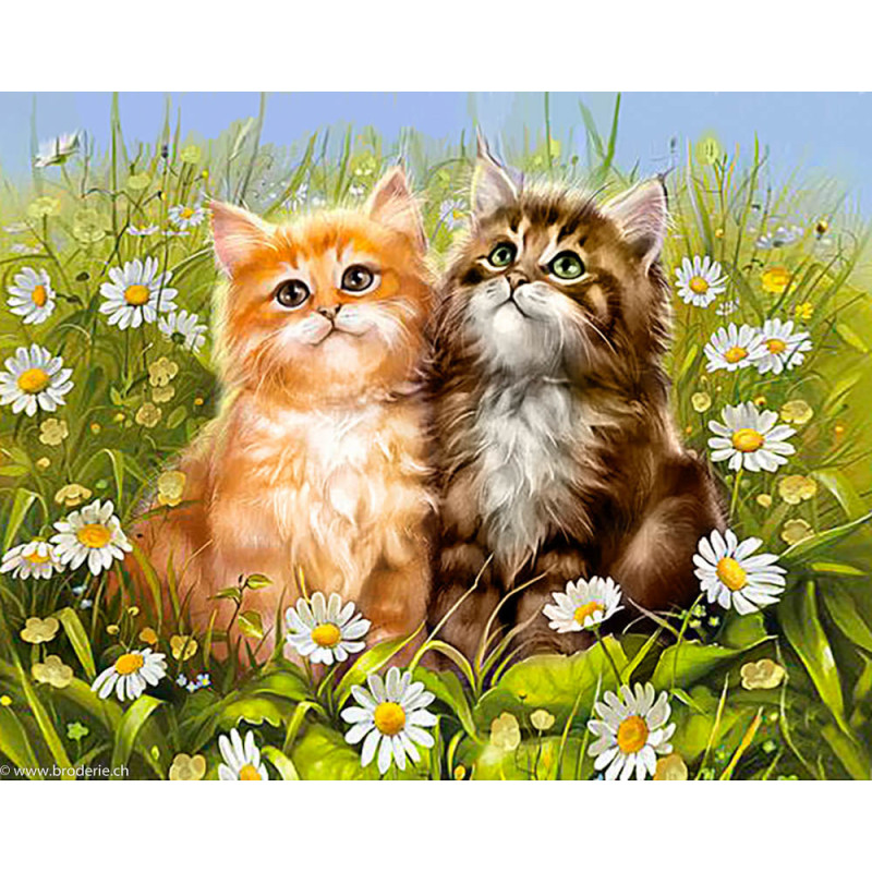 Wizardi, kit diamant Summer Kittens (art. WIWD209). Dimensions: 48 x 38 cm. Kit complet de Broderie Diamant comprenant la toile adhésive imprimée à recouvrir de strass, les sachets de strass 'diamants' carrés triés par couleurs, un stylet et sa cire, un réceptacle et les explications. La totalité de la surface est à recouvrir. ATTENTION, ce n'est pas une broderie, pas de fil ni d'aiguille, mais une mosaïque.